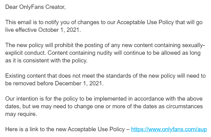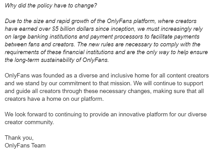 Onlyfans just sent out an email confirming sexual content will be banned and that it is in fact due to pressure from the financial institutions.pic.twitter.com/tQYPYSjd0f