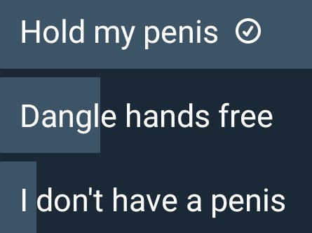 1/2 This poll is confounded by standing/sitting. I answered "Dangle" only because I usually sit to pee. When I stand, I hold.