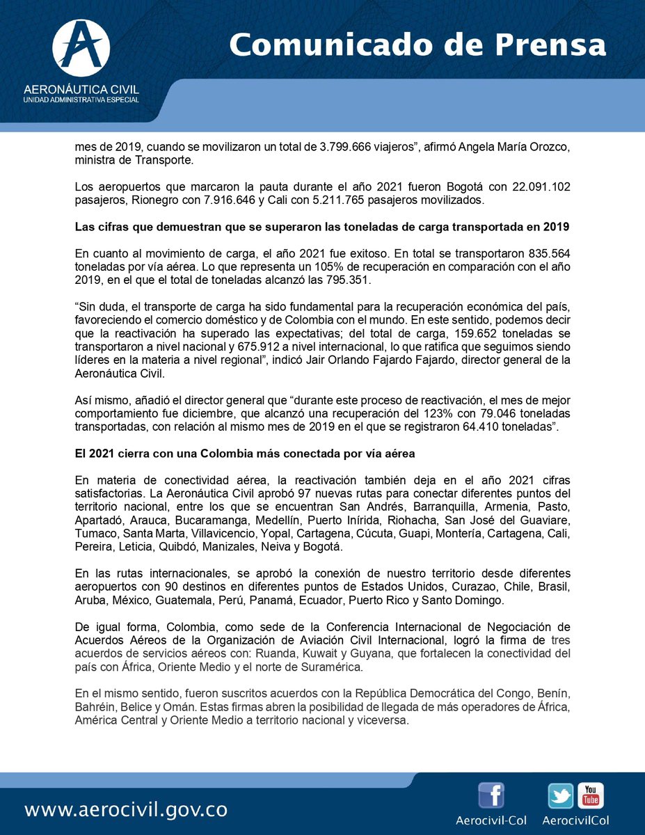#ComunicadoDePrensa | Colombia superó la meta de 30 millones de pasajeros movilizados y 835 mil toneladas de carga transportada en 2021.
