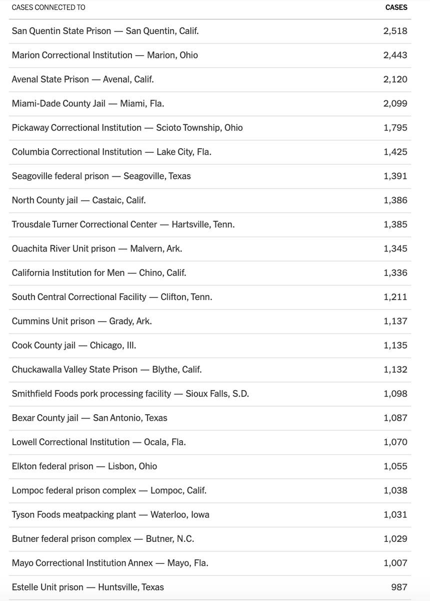 "In American jails and prisons, more than 176,000 people have been infected and at least 1080 inmates and correctional officers have died. " Almost, every single big cluster of outbreak is traced back to a prison or jail. https://www.nytimes.com/interactive/2020/us/coronavirus-us-cases.html … http://bit.ly/forshajia pic.twitter.com/HaLYul7G8Z