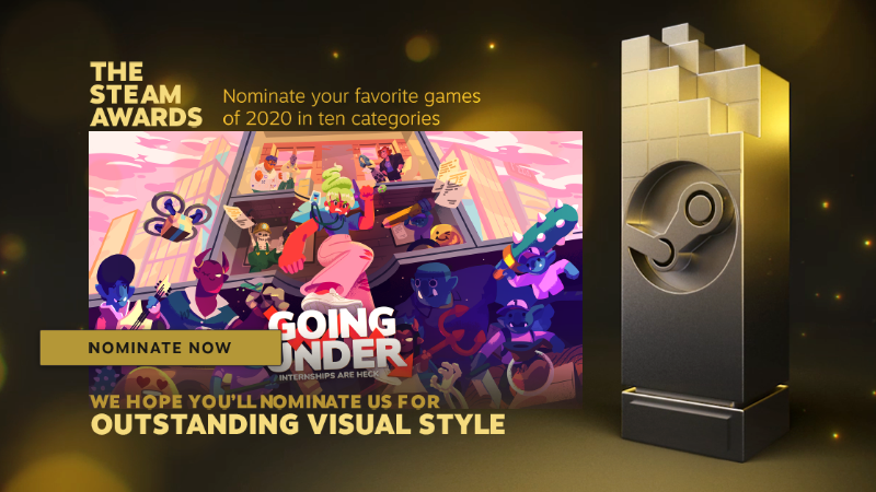 its the Steam Awards time of the year again, and you can help us get second place to Hades by nominating us for '𝗢𝘂𝘁𝘀𝘁𝗮𝗻𝗱𝗶𝗻𝗴 𝗩𝗶𝘀𝘂𝗮𝗹 𝗦𝘁𝘆𝗹𝗲' http://bit.ly/GoingUnderSteam pic.twitter.com/VZJJWS9Qij