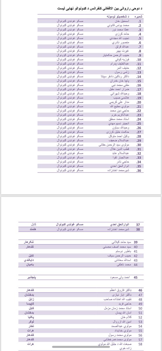 A 218-member delegation list leaked to media shows that govt & media representatives excluded from initial list which is a major reversal.. Moreover, pre Karzai’s name also seen in the list who’s office today said he will not participate in Qatar talks. #peacetalkspic.twitter.com/NhPPlbzYSq