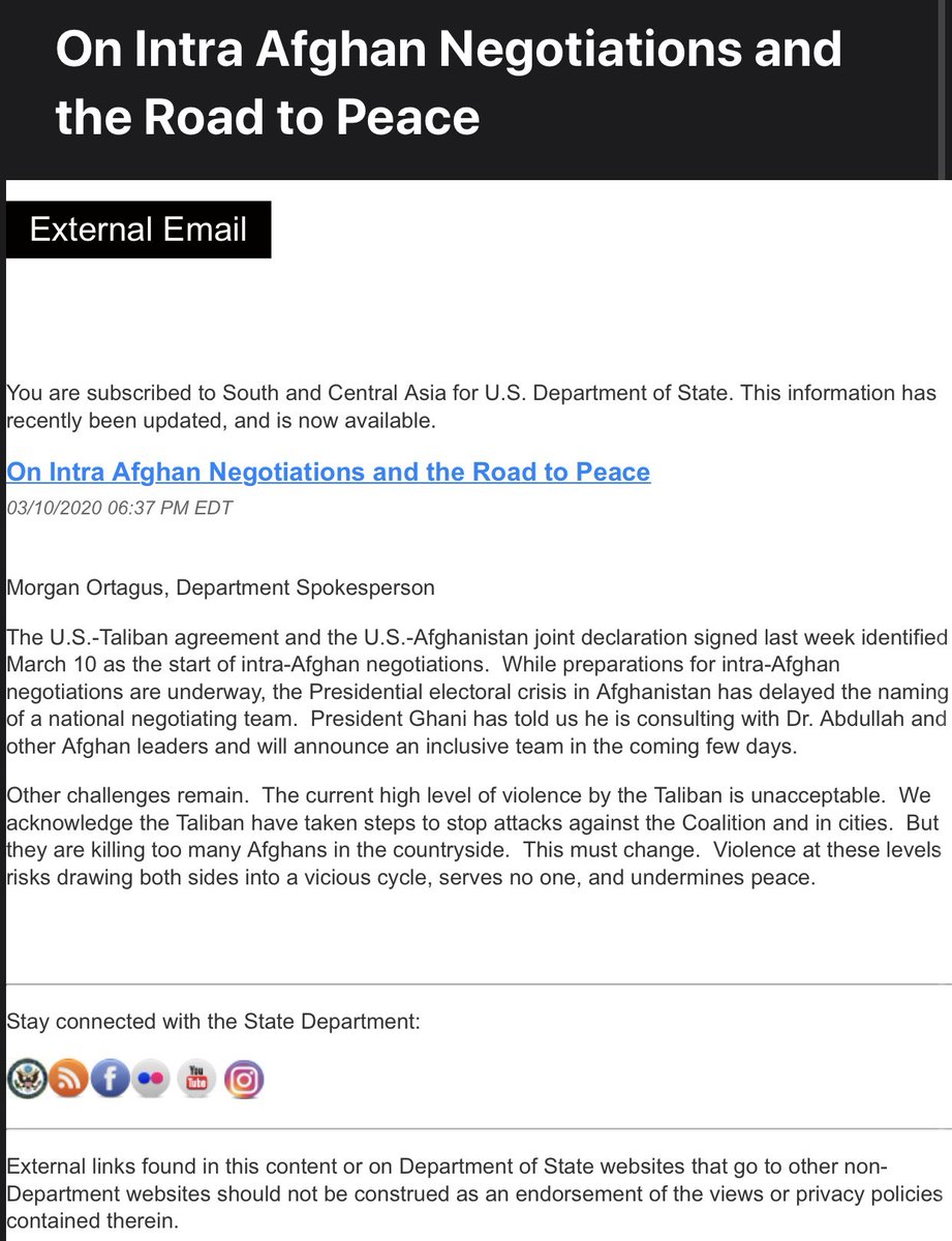 @StateDept announcement on the intra-Afghan negotiations, the high level of Taliban violence and election crisis!pic.twitter.com/jcxJB83AH1