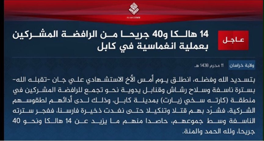 #Daesh claimed responsibility for suicide attack on Shia shrine in #Kabul which killed 20 peoplehttps://twitter.com/terror_monitor/status/786176073163694080 …