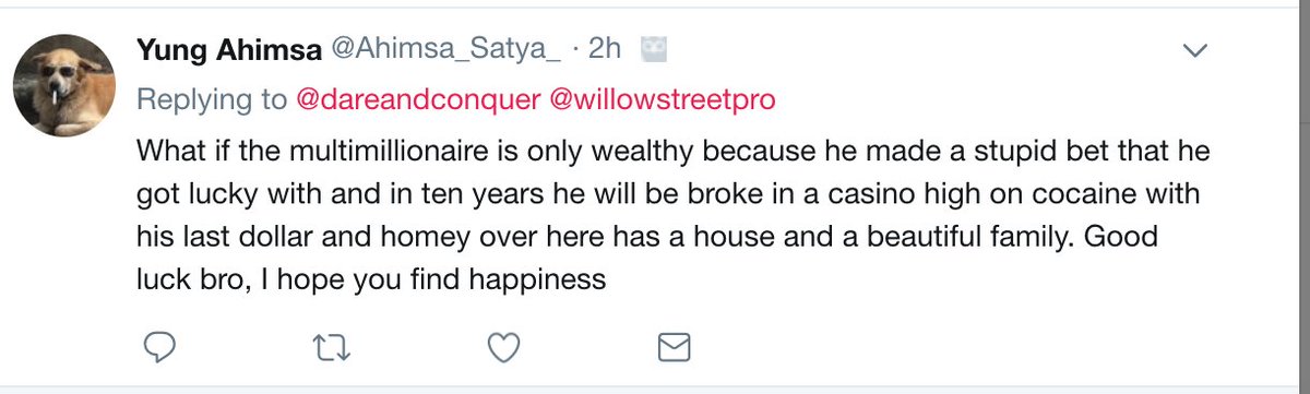 I sound like a loser to someone who has a dog smoking a cigarette set as his profile picture. I really wonder how he must look in real life to replace his face with that image. https://twitter.com/Ahimsa_Satya_/status/948967539492651008 …