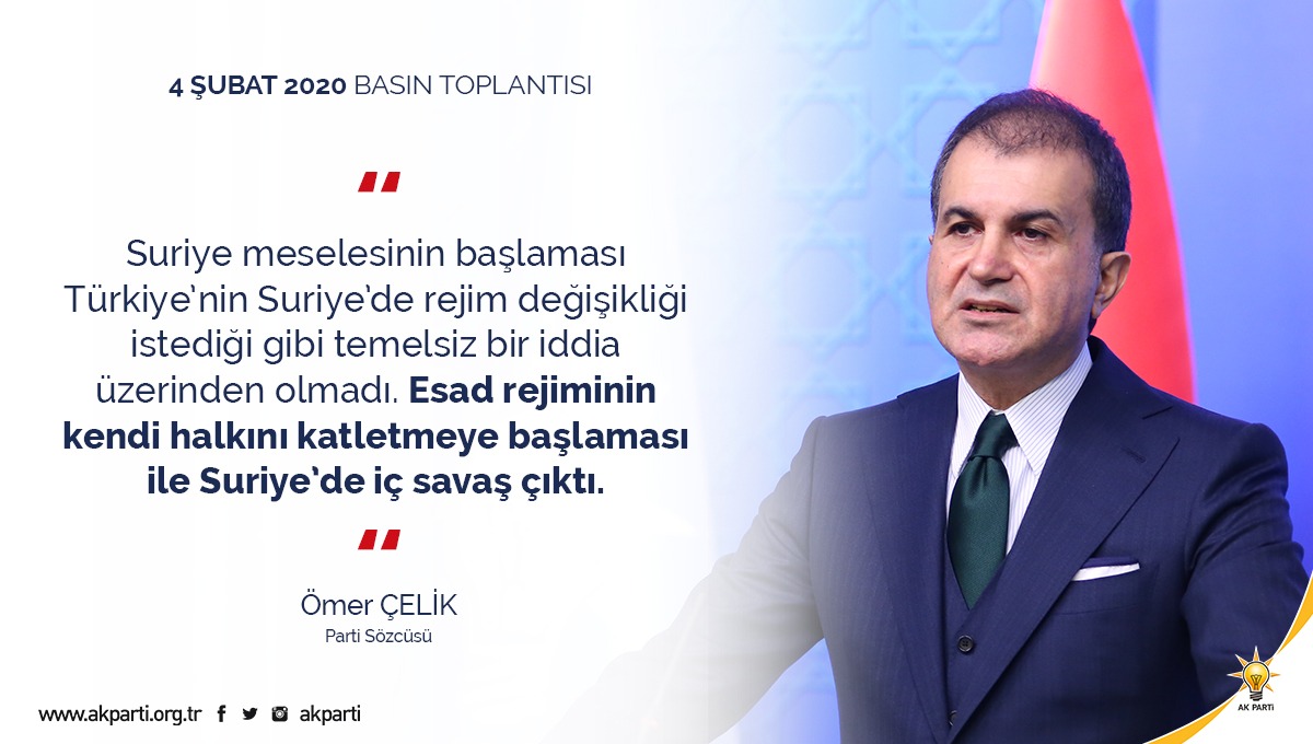 AK Parti Sözcüsü Ömer Çelik: Suriye meselesinin başlaması Türkiye’nin Suriye’de rejim değişikliği istediği gibi temelsiz bir iddia üzerinden olmadı. Esad rejiminin kendi halkını katletmeye başlaması ile Suriye’de iç savaş çıktı.pic.twitter.com/bPPJDDlunq