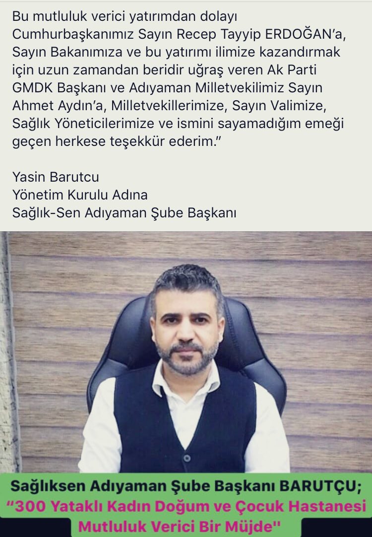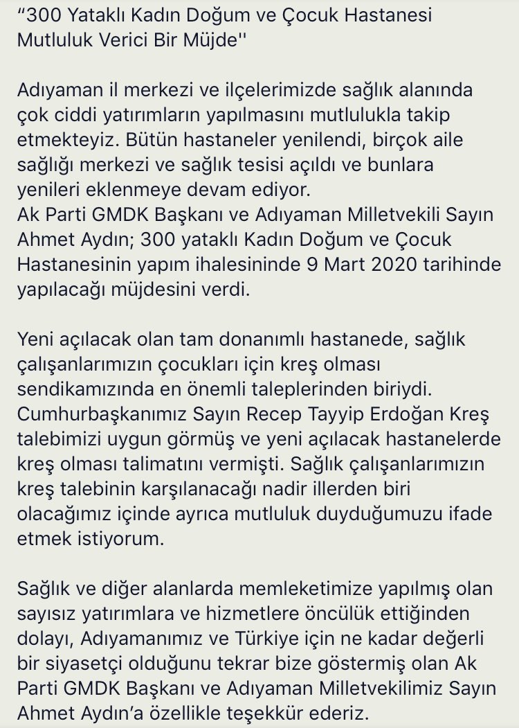 Ak Parti GMDK Disiplin Kurulu Bşk ve Adıyaman Milletvekilimiz Sn.Ahmet Aydın, 300 yataklı Kadın Doğum ve Çocuk Hastanesinin yapım ihalesinin 9 Mart 2020tarihinde yapılacağının müjdesini verdi. Emeği geçen herkese teşekkür ederiz.