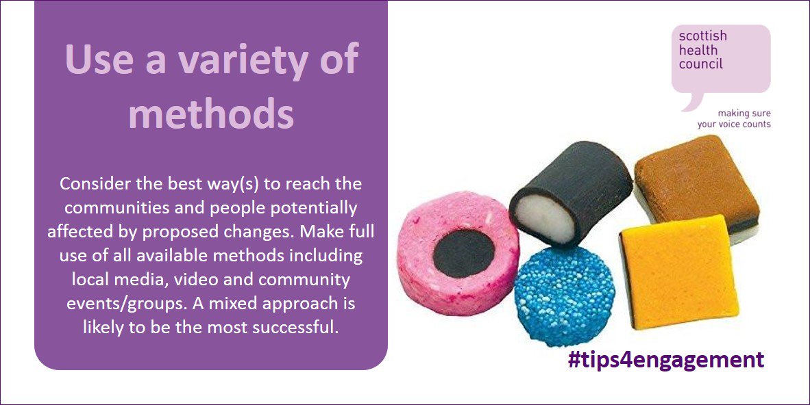 We’re currently sharing our top tips for engaging with people. It's important to tailor your approach to suit the people you want to hear from; one size doesn't fit all. Find more at http://www.scottishhealthcouncil.org/tips.aspx and share yours using