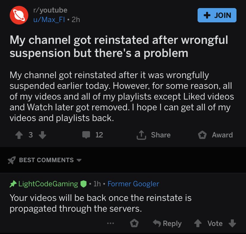 To those that don't know - Lots of people who lost their channel last night have been getting them back. Even though they have seemingly lost their videos, there is a good chance they will come back sometime soon. pic.twitter.com/egtBr5DxLi