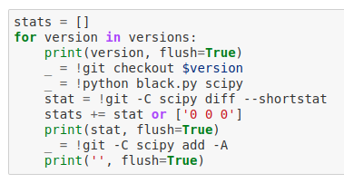 #IPython: determine which versions of the black Python code formatter change the formatting style. I applied every single version of black to scipy and used git to track changes. Here's the result: https://nbviewer.jupyter.org/url/antonakhmerov.org/misc/black_benchmark.ipynb …pic.twitter.com/yXodcfXGID