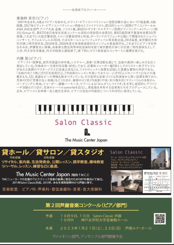【コンサート情報】5月3日(火祝)は芦屋Salon Classic(兵庫県)で東海林茉奈さん