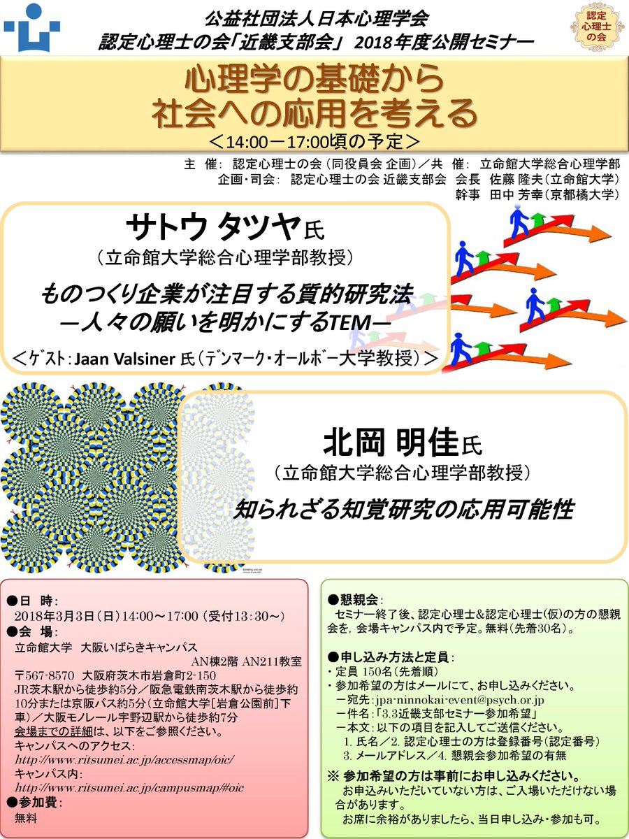 公益社団法人日本心理学会 認定心理士の会 「近畿支部会」 2018 年度公開セミナー 「心理学の基礎から社会への応用を考える」 の詳細は添付画像をごください。 2019月3月3日(日)14:00-17:00 立命館大学大阪いばらきキャンパス・AN211pic.twitter.com/4LDw5kYxFJ