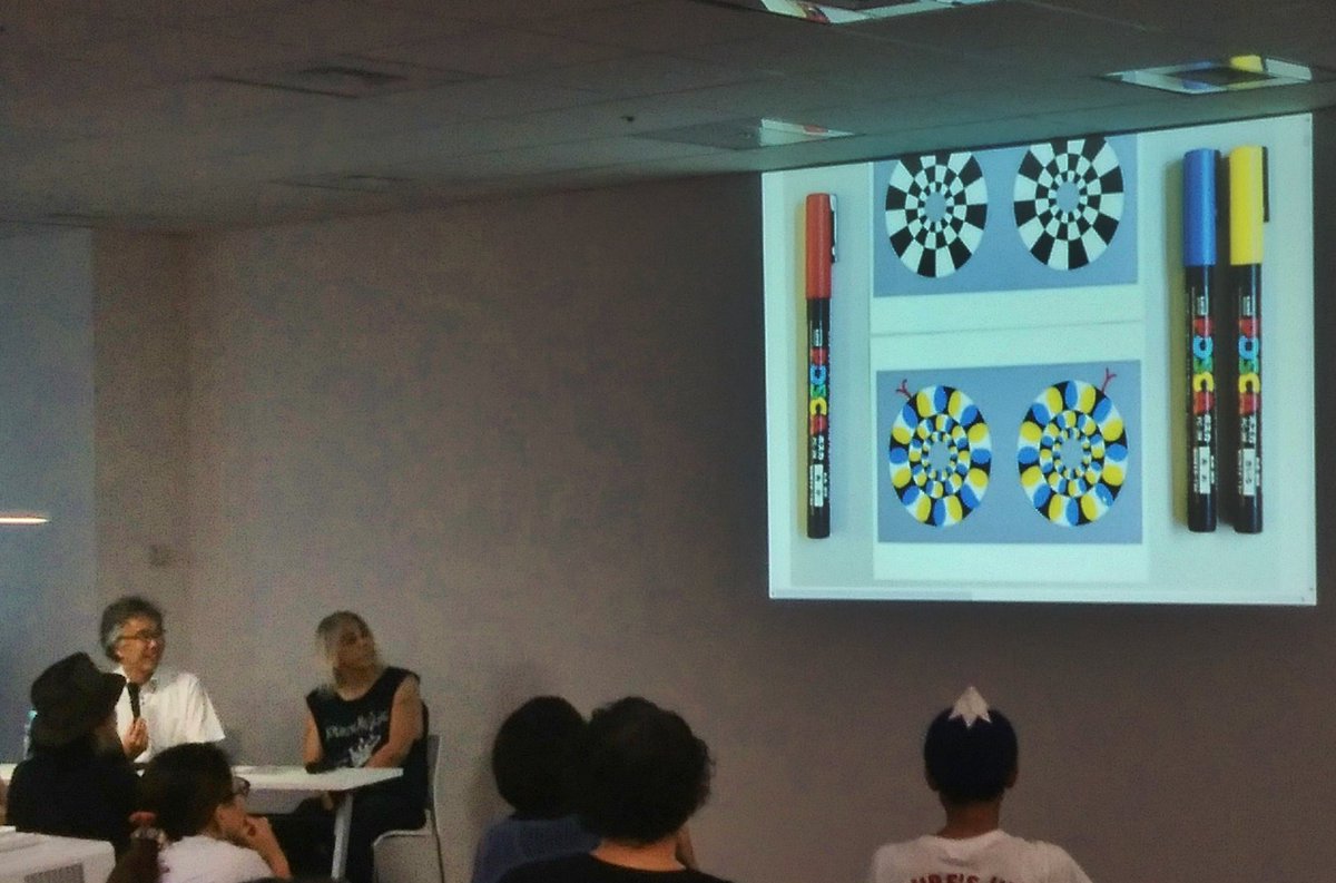 マッドジョージ氏×北岡明佳氏トークショー終了!錯視のメカニズムをサンプル付きで惜しげもなくご説明。理屈を知ればポスカでも描ける!? 探求の続きは北岡教授のHPと本で http://www.ritsumei.ac.jp/~akitaoka/ 終演後の井戸端トークで聞けたガガCDデザインの経緯、”不気味の谷”の話が個人的裏ハイライトでした。pic.twitter.com/zgLhGdraAa