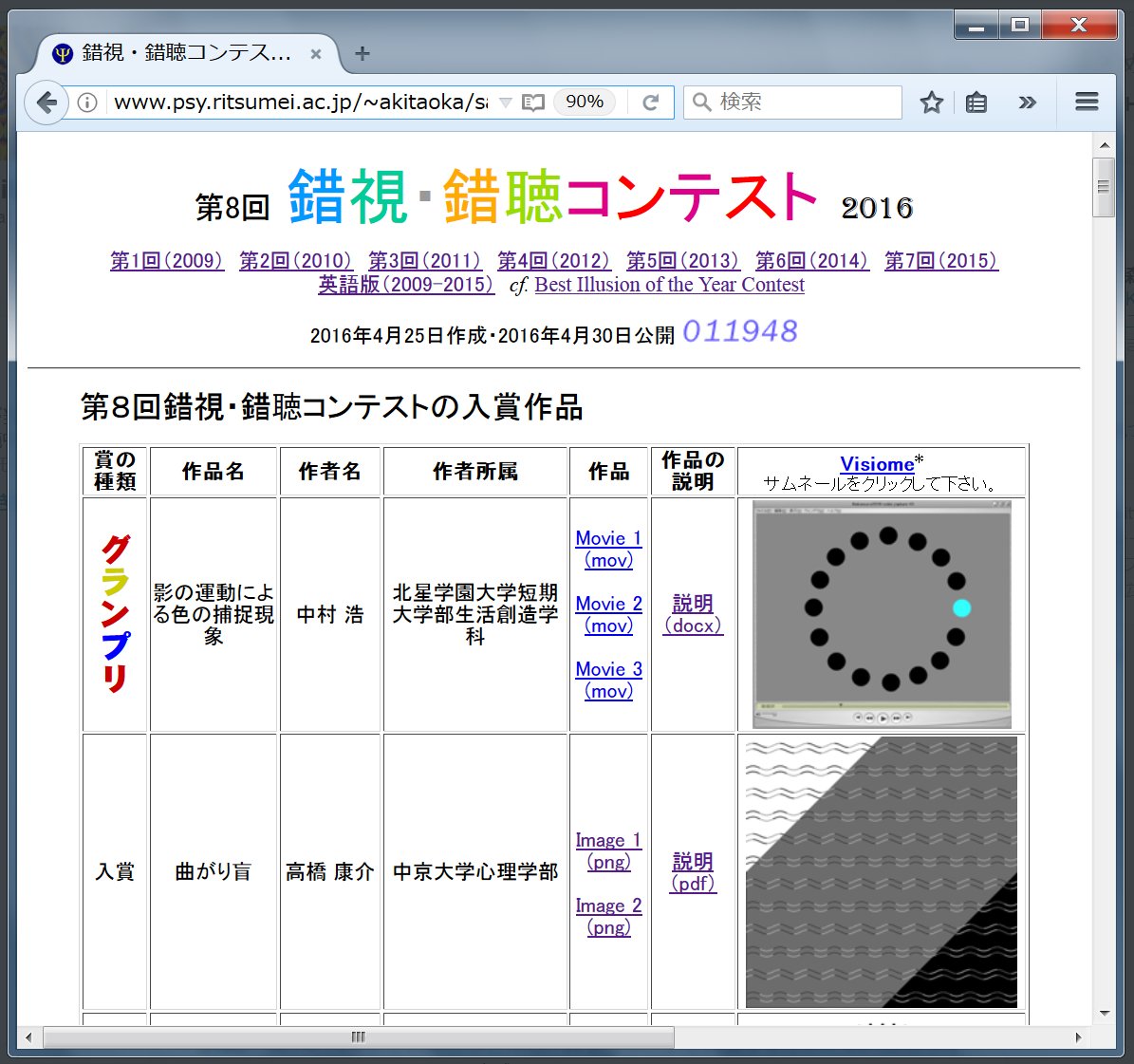 第8回錯視・錯聴コンテストのサイトの整備が完了(全作品のVisiomeへの登録が完了)。 (the 8th Illusion Contest Japan) http://www.psy.ritsumei.ac.jp/~akitaoka/sakkon/sakkon2016.html …pic.twitter.com/j5MHCzneQj