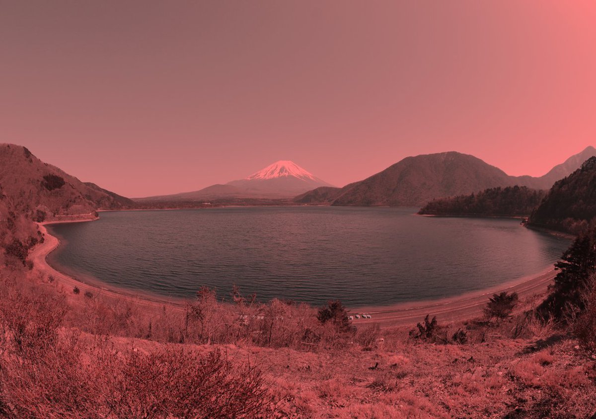 Mt. Fuji and Lake Motosu appear to be bluish, though the pixels are all red hue. (transformed with the two-color method)pic.twitter.com/tArhYDYnel
