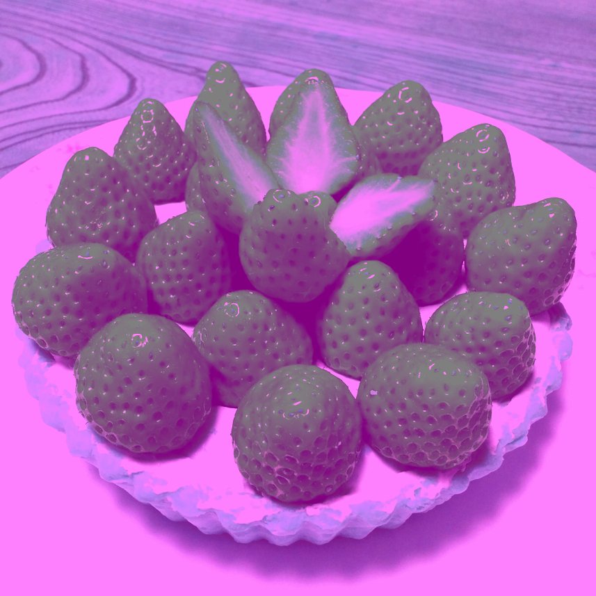 "Greenish strawberries": Strawberries appear to be greenish, though the pixels are not. 「緑の苺」:マゼンタ色(およびその付近の色相)か灰色の画素でできているが、イチゴは緑色に見える。pic.twitter.com/2qJ2p8kd5D