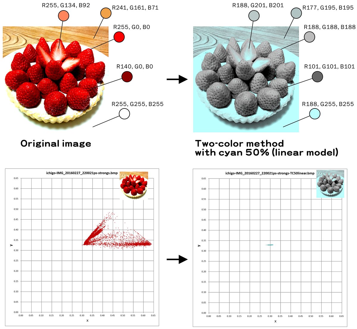 二色法のxy色度図上の変化。色度図の分布からは同じ画像であるとは想像できません。 Distribution of color dramatically shifts to cyan with the two-color method.pic.twitter.com/lSmSd9zlLs