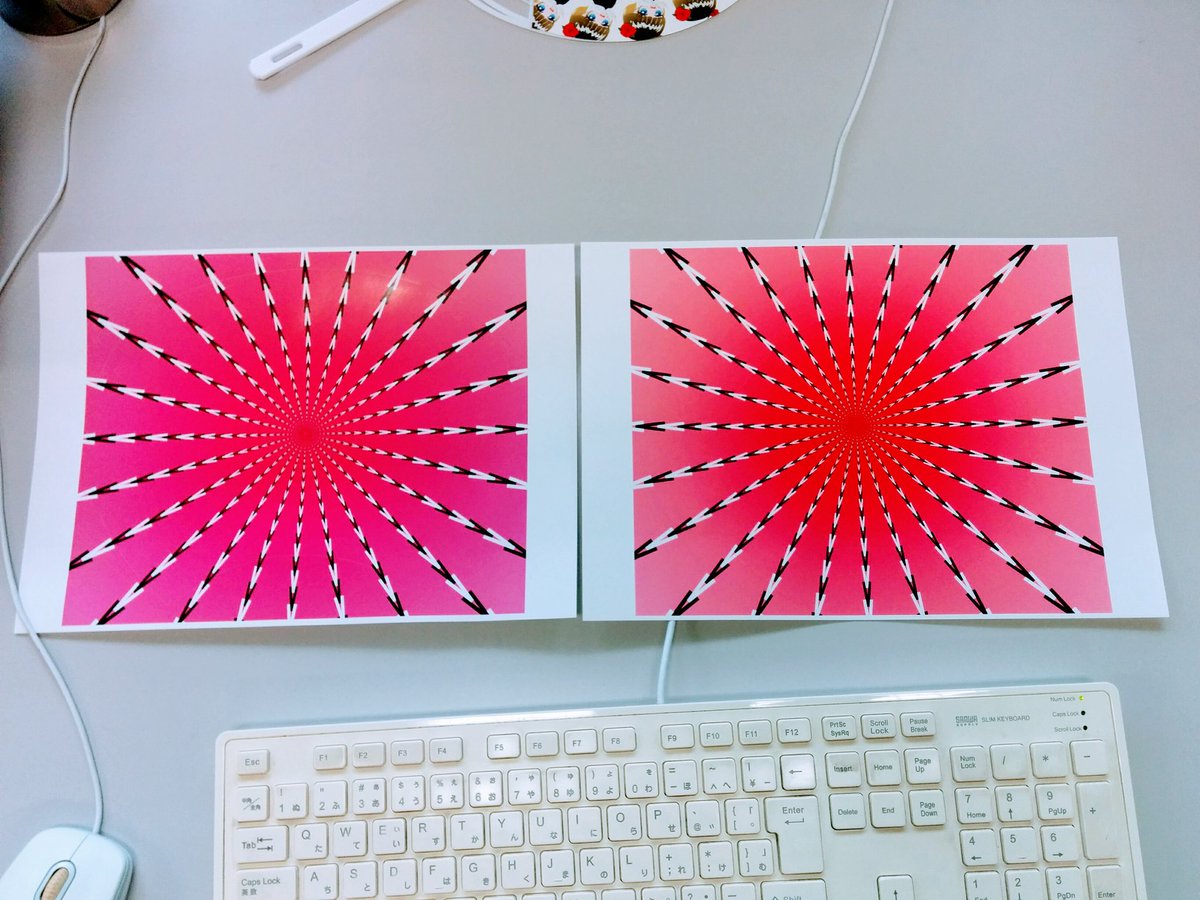 エプソン機(左)印刷かキヤノン機印刷(右)か。キヤノン機はオリジナル画像と少し色相が違うのですが、錯視が強い。錯視で選ぶべきですね。pic.twitter.com/cHSDZXxj6s