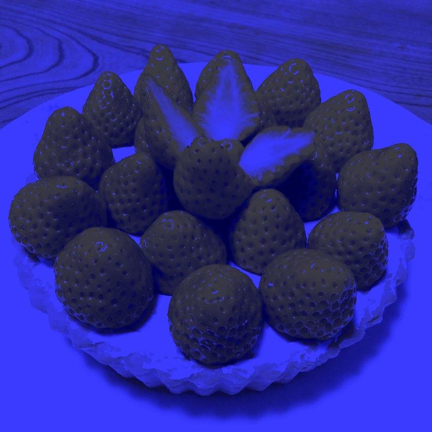 このパラメーターもいいかも。ガンマ値0.5で合成。アルファ値は48%。すべて青色の色相の画素でできているが、イチゴは黄色く見える。pic.twitter.com/YXElERITrx