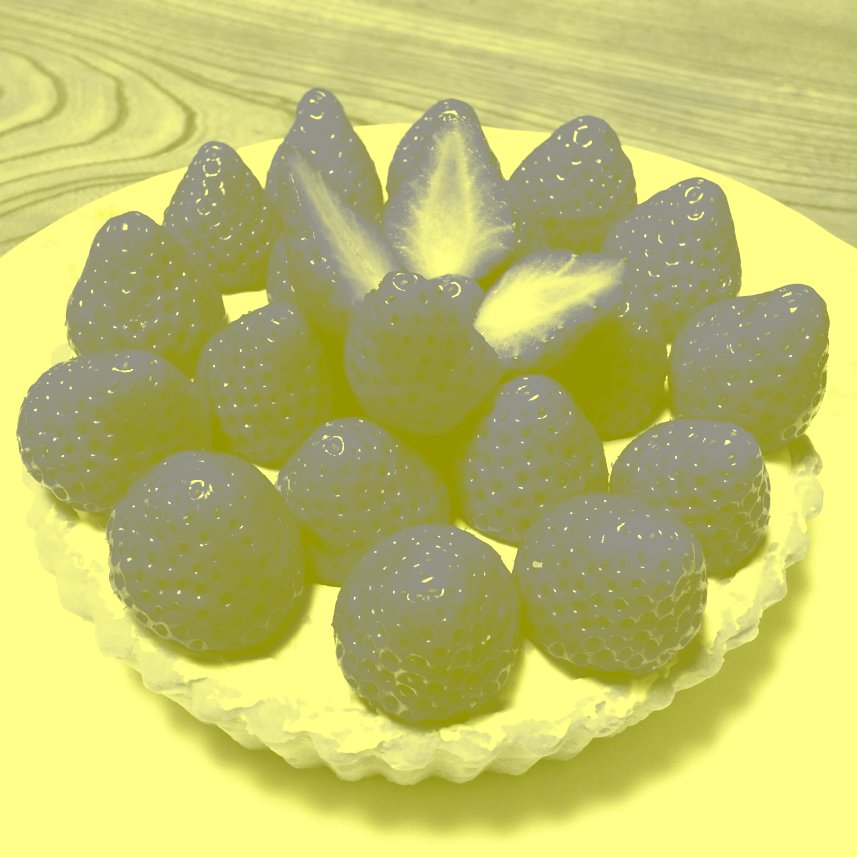 すべて黄色の色相の画素でできているがイチゴは青く見える画像は、本日私の評価では、ガンマ値1.2の見栄えがよろしかったです(アルファ値は48%)。pic.twitter.com/9kQKGQcNUg
