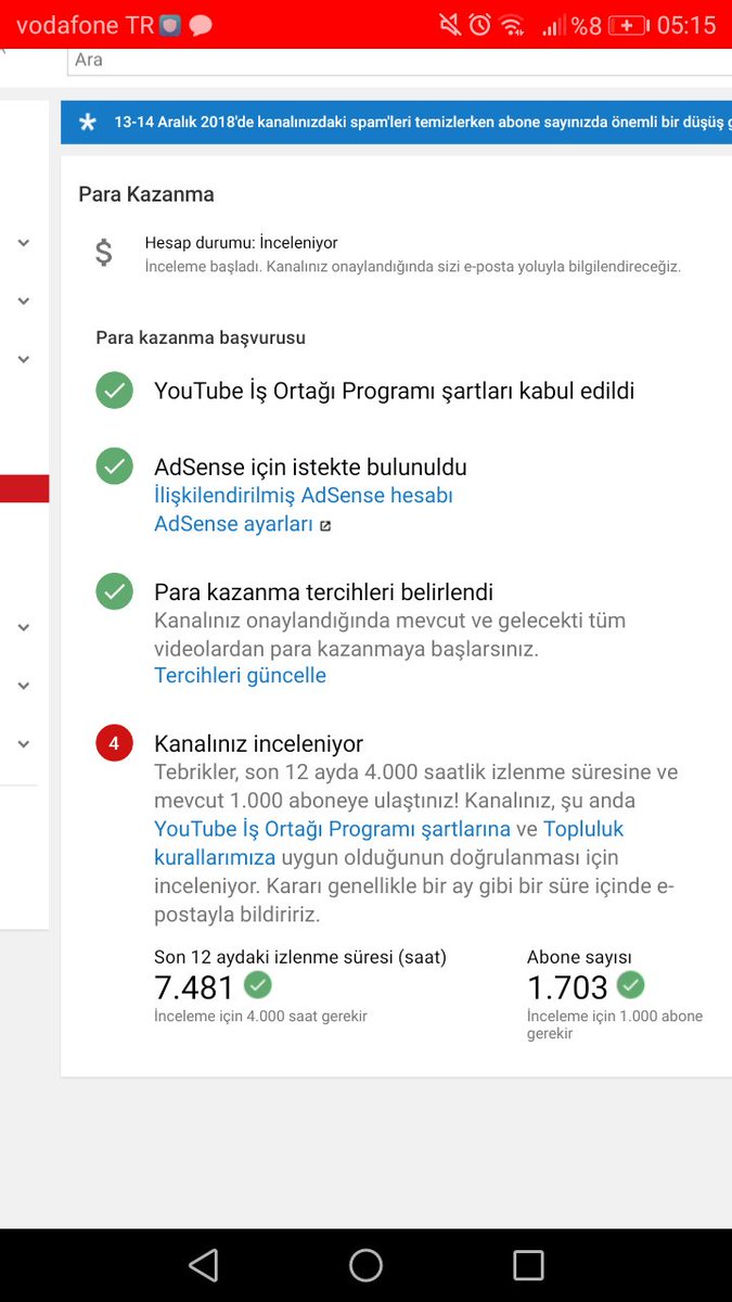 Bilgi için teşekkür ediyoruz. Genelde aşağı yukarı bir ay içerisinde bildirim size E-posta olarak gönderilir. Daha uzun sürüyorsa, bu muhtemelen kanalınızın ikinci bir inceleme için tutulmakta olduğu anlamına gelir. Sabrınız için şimdiden teşekkür ediyoruz.