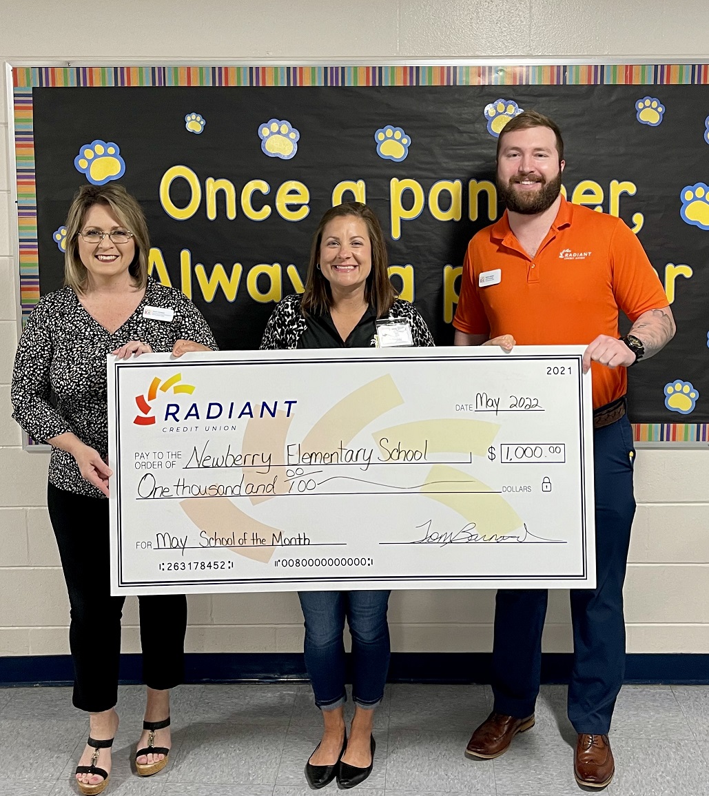 Radiant Credit Union presented Newberry Elementary School with a check for $1,000 after being selected as May's School of the Month.pic.twitter.com/RsV0yhoADs