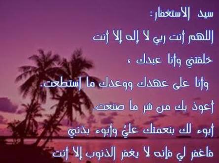 اللهم أنت ربي لاإله إلاأنت خلقتني وأنا عبدك وأنا على عهدك ووعدك مااستطعت أعوذ بك من شر ماصنعت أبوء لك بنعمتك علي وأبوء لك بذنبي فاغفرلي فإنه لايغفر الذنوب إلا أنت.