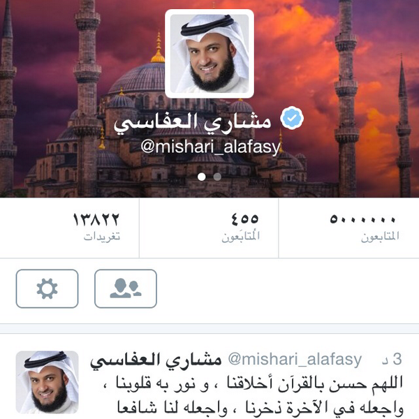 عاجل / الشيخ مشاري راشد العفاسي أول كويتي يتجاوز 5مليون في تويتر و7مليون في الفيسبوك