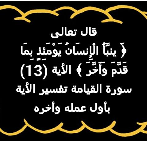 قال تعالى ﴿ َينبَّأُ الْإِنسَانُ يَوْمَئِذٍ بِمَا قَدَّمَ وَأَخَّرَ ﴾ الأية (13) سورة القيامة تفسير الأية بأول عمله وأخرهpic.twitter.com/p0ydvhgGys