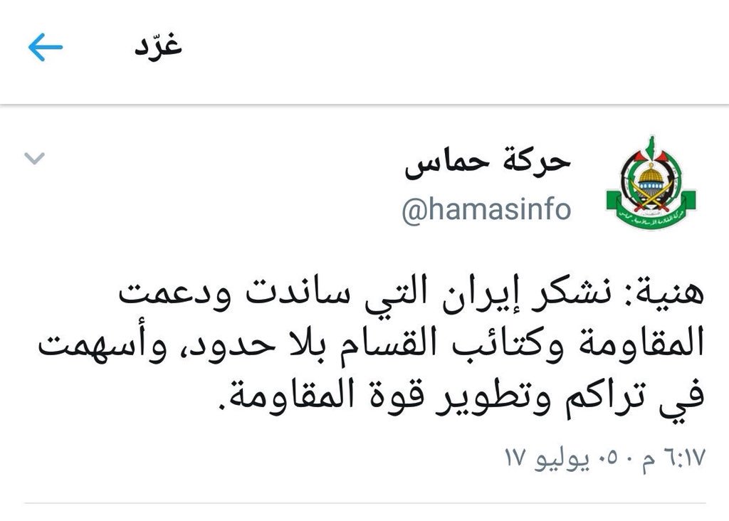 اعرف إيران واركانها وش سوت بسوريا من مذابح ومجازر يكفي وهذا من نظامها لكن السؤال يا محمد تعرف منو حماس ؟ شنو سوت بإسرائيل واليهود وبالخونه العرب من قريب ومن بعيد وليش انحدت على إيران ؟