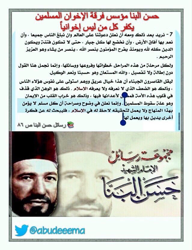 الإخوان المسلمين هي فكرة وليست أشخاص، فمنهم الصالحون ومنهم دون ذلك. أمّا هذا الرجل تحديداً "البنّا" فهو رجل بأمّة، ولو بحثت عن تكملة لكلامه لفهمت أن "المنهاج" هو منهاج النبوة من الجد والإخلاص والترابط لا منهاج "التنظيم". ولكن لا عزاء لأهل الدنيا ممن يشارك في مشروع "إسقاط القدوة".