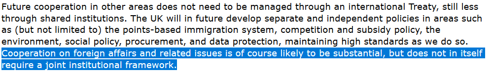 In a much broader version, the UK gov has also published its vision for the future EU-UK agreement: https://www.parliament.uk/business/publications/written-questions-answers-statements/written-statement/Commons/2020-02-03/HCWS86/ … Really highlights how the UK wants to achieve a much looser framework. For instance, it rejects institutionalised coop on Foreign Affairs altogether.pic.twitter.com/90RmtrkTWm