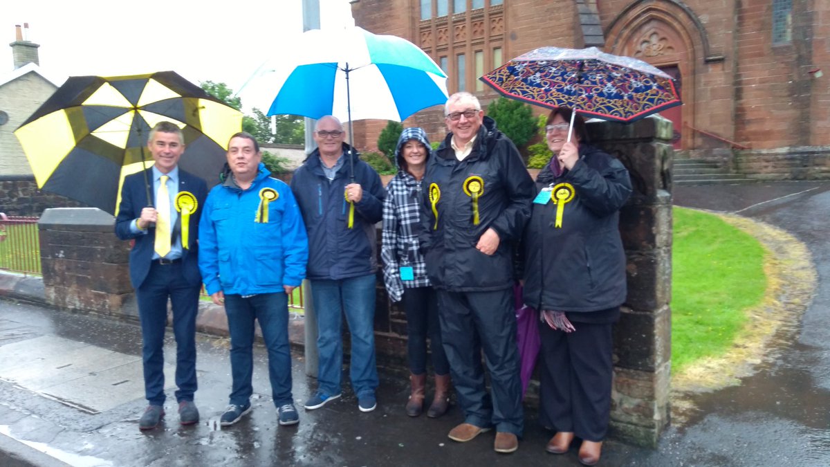 With council leader Dougie Reid, and backdrop of the new Ayrshire College. 45 minutes left to vote & 3 more polling places