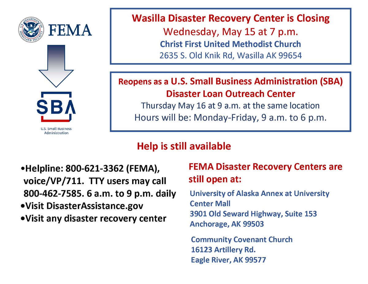 Alaskans: Wasilla Disaster Recovery Center closes permanently on May 15. The center, located at Christ First United Methodist Church, will transition to a U.S. Small Business Administration Disaster Loan Outreach Center on May 16.pic.twitter.com/QctXczTENz