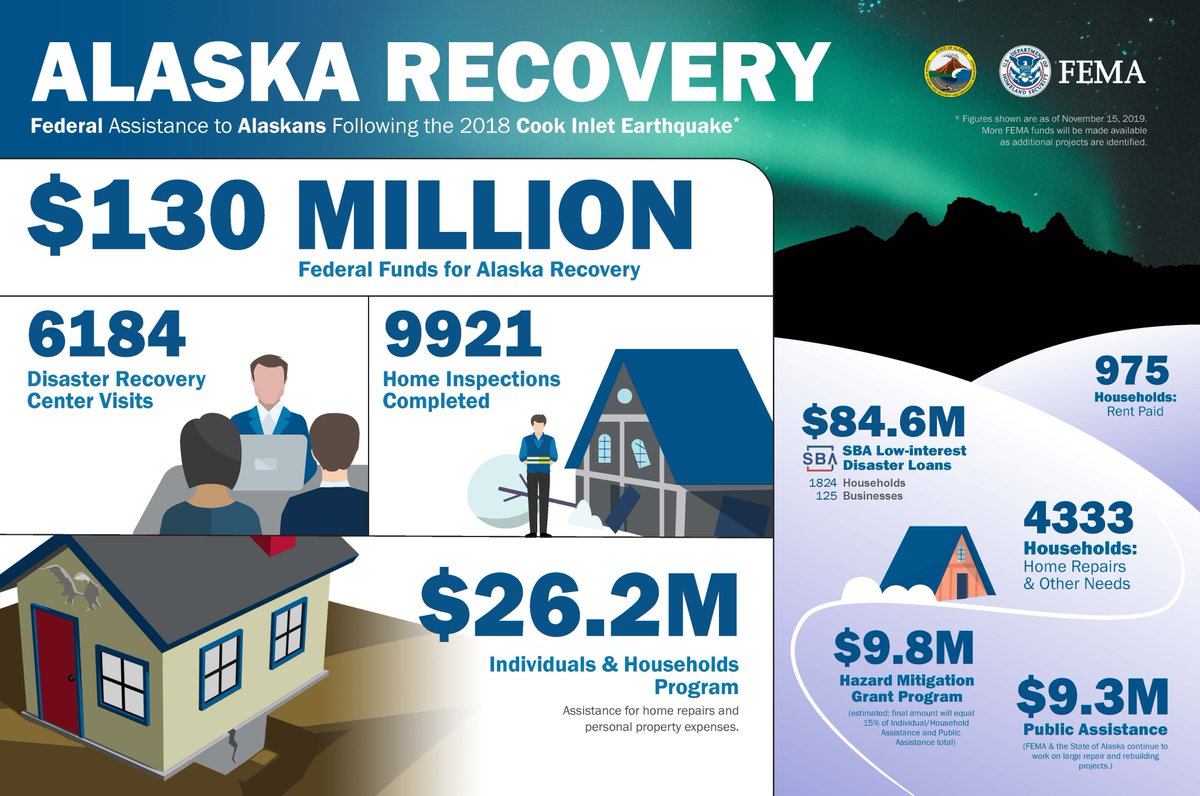 @FEMA assistance for the Nov 30, '18#AlaskaEarthquake. Impacts were significant and far-reaching, and the recovery process is still underway. With our state partners, we continue to help survivors repair and rebuild.pic.twitter.com/LEEjpsFlPC