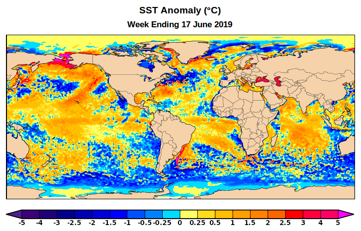 Global surface area above +5°C anomaly in OISSTv2 reached 966,000 sq-km on June 20, which is the highest on record for this early in summer - with the largest contribution from the Bering/Chukchi. Larger areas above +5°C have occurred in July-September, e.g. 2007, 2011, 2016.pic.twitter.com/7J5NJf0Q29