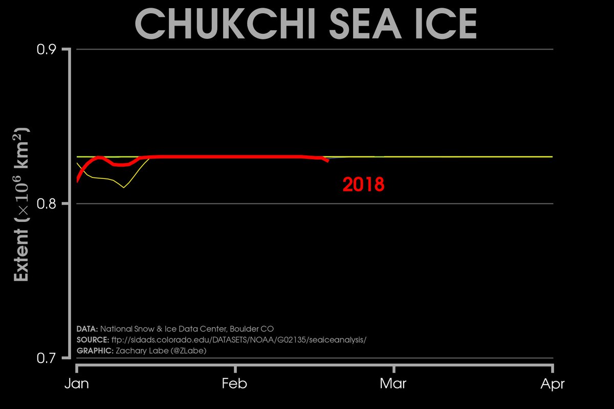 Looks like a small and rare mid-winter sea ice dip in the Chukchi Sea today from the NSIDC passive microwave data. All years are actually shown on this graph.pic.twitter.com/pG3HUVjk0m