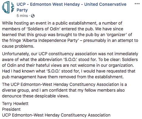 UCP Edmonton-West Henday Constituency Association President responds to hateful group 'Soldiers of Odin' being present in a public venue in which the CA hosted an event. These hateful views have no place in our party. #ableg #abpoli #UCPpic.twitter.com/z50plztSCB