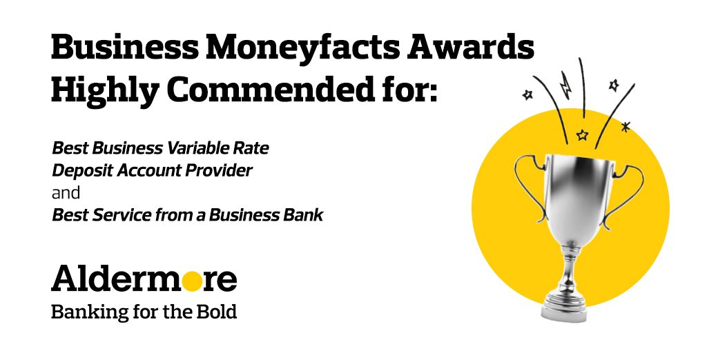 On top of our two awards wins at the Business Moneyfacts Awards, Aldermore were highly commended in the Best Business Variable Rate Deposit Account Provider and Best Service from a Business Bank categories. A great achievement for us all - onwards and upwards!