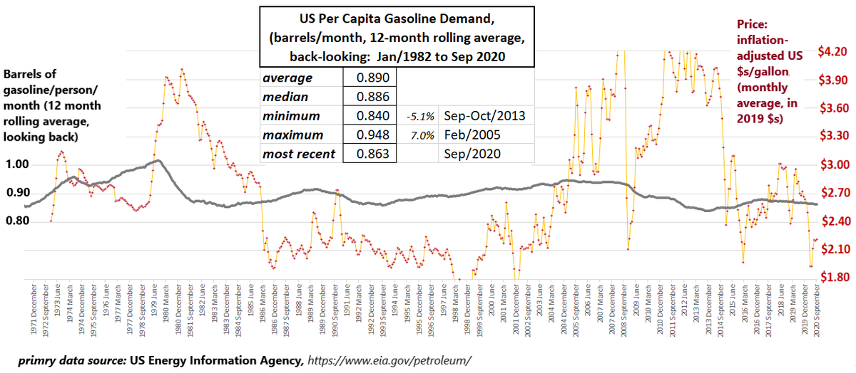 It is amazing how stable (and relatively price inelastic) US per capita gasoline demand is. Each point on this graph reflects 12-month (back-looking) per capita monthly average demand. No statistically significant change--at least not yet--since 1982!pic.twitter.com/sbWLSUFqSE