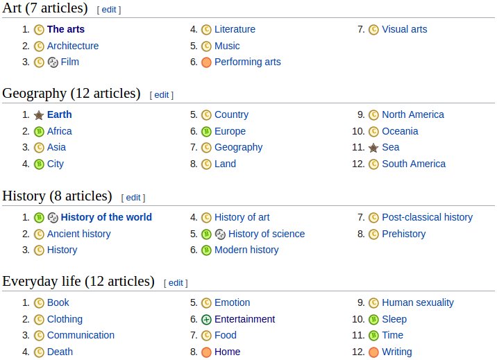 Just stumbled across Wikipedia's vital article lists containing the top 10 -> 100 -> 1,000 -> 10,000 most important articles. Very cool and useful resource from a concept learning perspective! Here's a subset of the top 100:pic.twitter.com/T8RTxU89BW