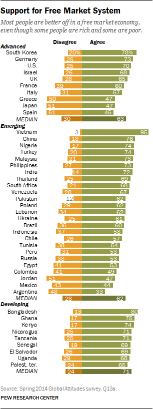 Would be interesting to cross-reference this with GDP growth rates over last 10-20 years. Not surprisingly, seems like very high correlation between acceptance of free market and recently high GDP growth