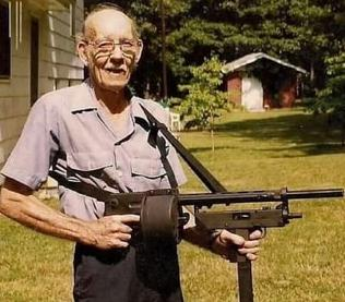 Three old men with uzis mounted beneath some sort of riot shotgun?