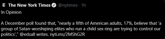 The great thing about being an elite cabal of Satan-worshiping pedophiles is that you "obviously" can't exist.https://twitter.com/WrappedInThFlag/status/1357149844532510720?s=20 …