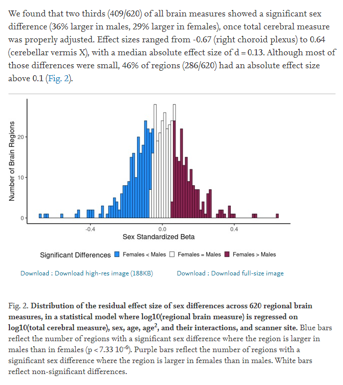 "We found that two thirds (409/620) of all brain measures showed a significant sex difference (36% larger in males, 29% larger in females), once total cerebral measure was properly adjusted." (N = 40,028) https://www.sciencedirect.com/science/article/pii/S0149763421003900 … pic.twitter.com/AqgascGqMn