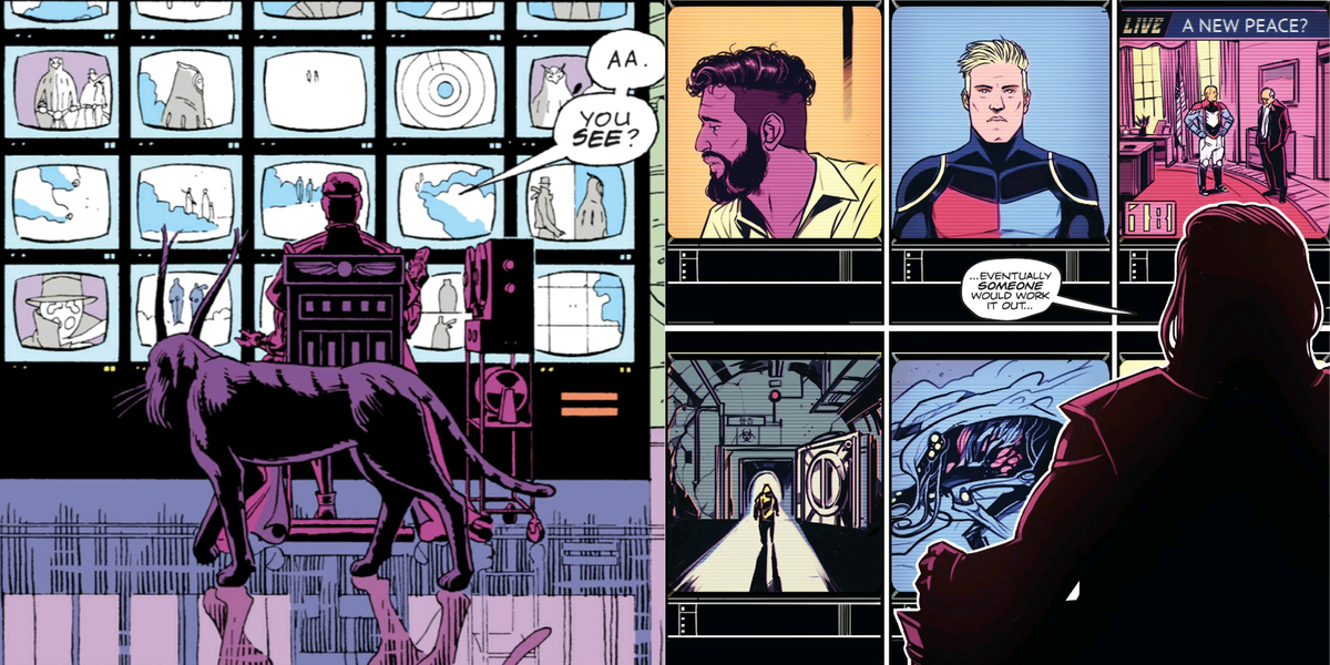 But then I hit the big reveal: the city-destroying alien invasion was actually a hoax, perpetrated by an alt-universe Peter Cannon, complete with Arctic base, wall of TV screens and ridiculous armour. All he’s missing is the genetically-engineered cat.pic.twitter.com/WTrMvFylB4