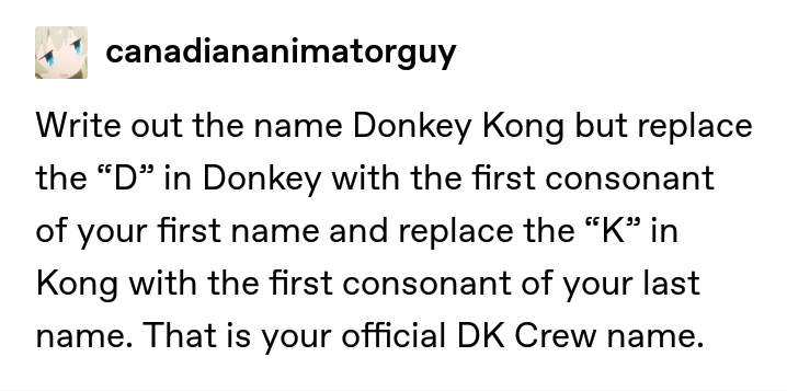 I'm so upset. I feel utterly let down, my dreams shattered. My DK Crew name is "Donkey Cong." This absolutely sucks. pic.twitter.com/SVBS3THZVK