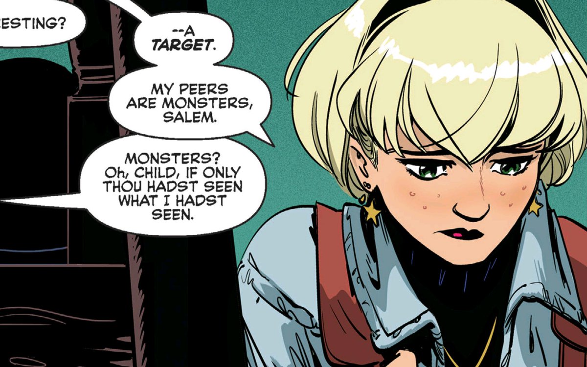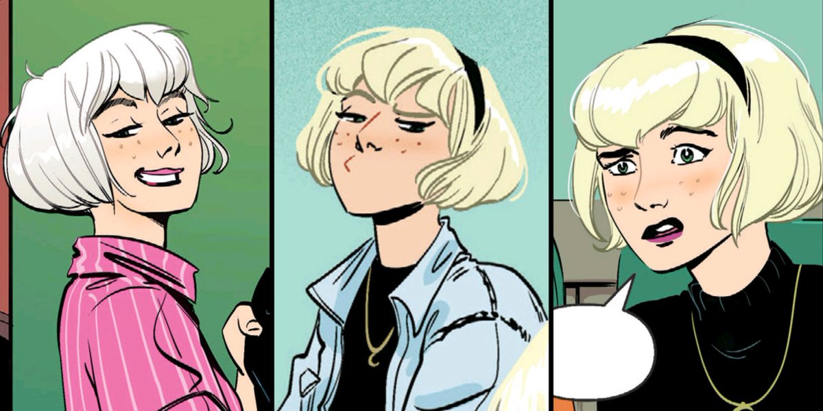 I like the Fishes' design for Sabrina, mixing and updating various influences – but the best bit is how expressive she's drawn. The cartoony elasticity of Sabrina's facial expressions really helps sell jokes and moments of teen drama.pic.twitter.com/5XLsykR3pf