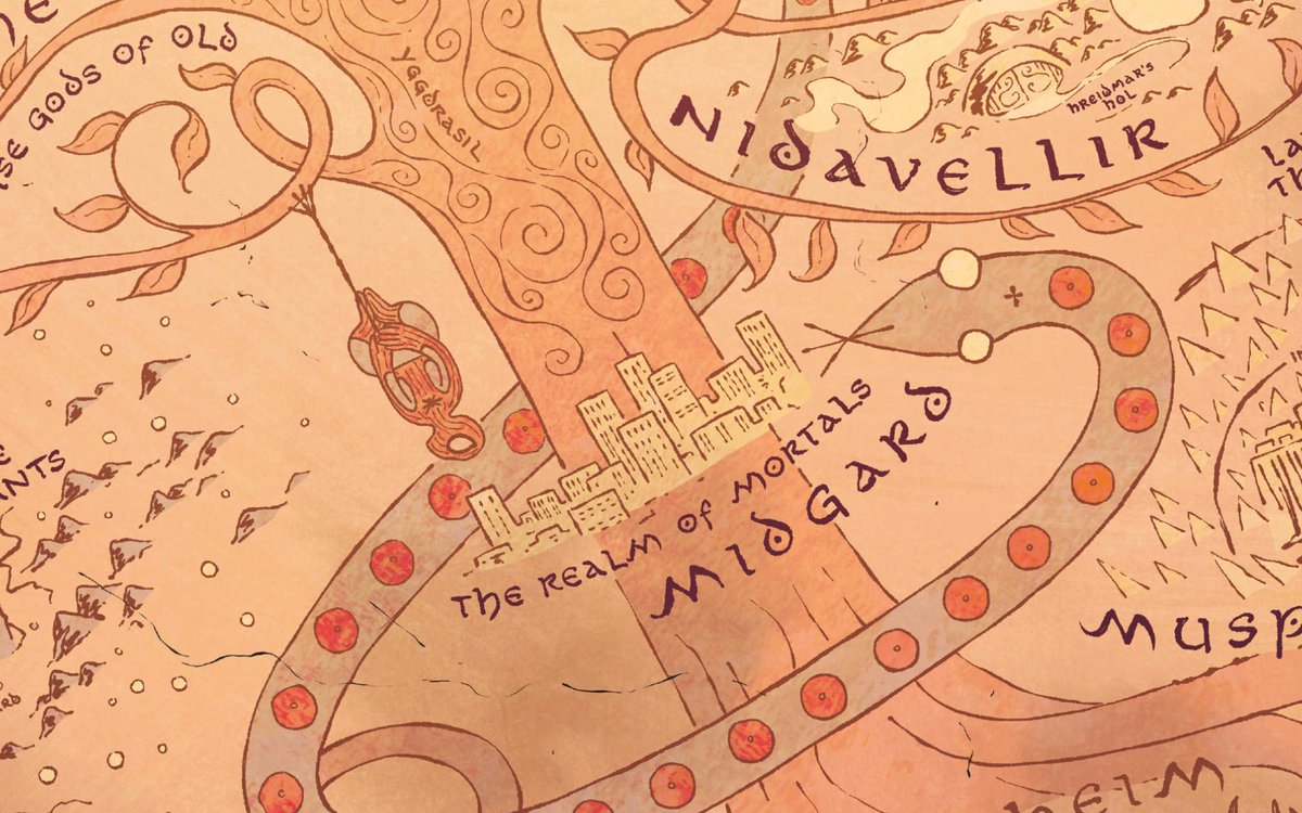 I also love that Midgard is represented by a New York skyline and a lil’ cartoon Spidey. It’s a beautiful encapsulation of Marvel Earth and – because of the contrasting modernity and the MU’s most down-to-earth hero – a neat little subversion of the epic fantasy map trope.pic.twitter.com/NzDQrYKAxi
