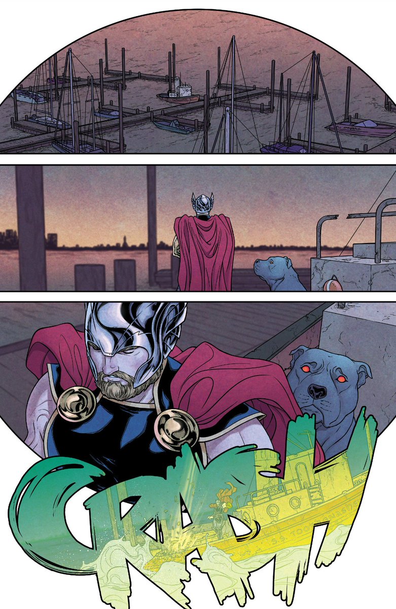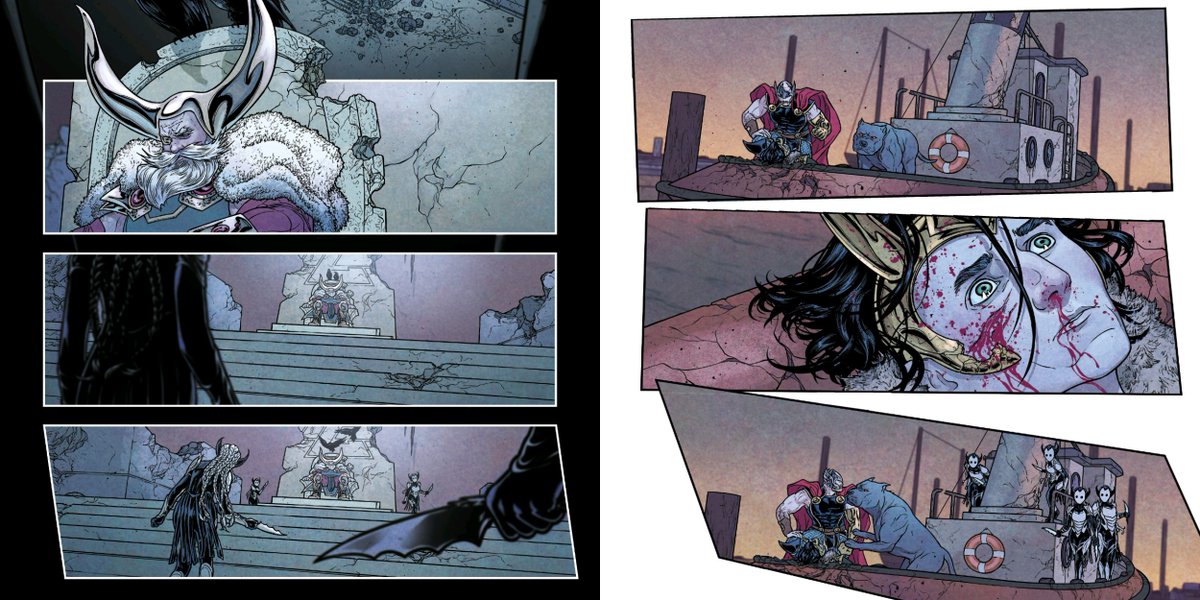 This is a lovely layout that's maybe meant to evoke a globe shape (given it’s the first time we visit Midgard this issue), or a sunset and its reflection on the water. Or maybe it’s just pretty.pic.twitter.com/WULAiCFACx